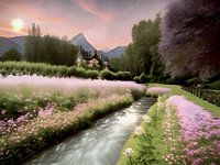 Het landschap staat in volle bloei en wordt al deels in schaduwen gehuld door de vallende nacht.