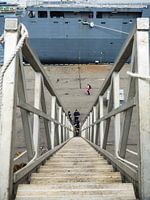 Aan het einde van de ladder zie je drie mensen van de marine in Den Helder. Aan de overkant zie je nog een ander marine schip.