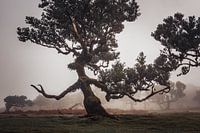 Donkere, moody foto van de op een Ent lijkende boom in het nevelwoud van Fanal, Madeira.