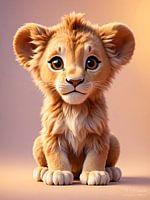 A.I. portret van een schattig leeuwtje met prachtige pastel kleurige achtergond in paars en oranje. Zeer geschikt werk voor in een kinderkamer in jungle stijl of boven het bedje van je baby.