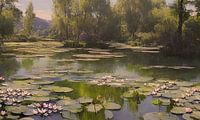 Helemaal zen aan de oever van de waterlelie-vijver. Rust, totale rust. Hier en daar zoemt een bij en een mug. De middagzon is zinderend, het water groen, eindeloos diep. Verderop ligt een eend te slapen, de bomen ruisen zacht. Een kikker springt van een blad.