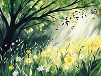Een idyllisch landschap toont een boom met groene bladeren die over een weide vol kleurrijke wilde bloemen leunt. Zonlicht stroomt door de bladeren en baadt het weelderige gras eronder in een warm licht.