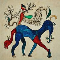 "The Creature's Vivid Dream" is een viering van de harmonie tussen natuur en verbeelding. Centraal staat een mythische viervoeter met een lange, vloeiende nek versierd met takken die lijken op een ingewikkeld gewei. Vogels in levendige tinten zitten sereen op de takken, hun vormen gaan moeiteloos op in de fantastische compositie.
