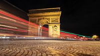 Ondanks het late uur is het nog erg levendig rond de Arc de Triomphe in Parijs. De lange sluitertijd en de autolichten zorgen voor een mooi kleurrijk beeld.