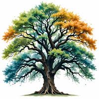 Dit levendige kunstwerk toont een majestueuze boom met gebladerte in een spectrum van kleuren, die de veranderende seizoenen en de voortdurende cyclus van het leven vertegenwoordigen. Van het frisse groen van de lente tot het warme oranje en geel van de herfst, elk deel van de boom vertelt een verhaal van groei, volwassenheid en vernieuwing. De ingewikkelde takken en wortels symboliseren de onderlinge verbondenheid van alle levende wezens.