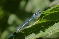 Een libel - Azurjungfer zonnen zelf op een brandnetel