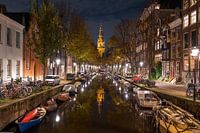 De stad Amsterdam ligt er door strenge Coronamaatregelen verlaten bij. De lichtjes branden echter wel zoals op dit beeld van de Groenburgwal en de Zuiderkerk goed te zien is. Het rimpelloze water van de gracht weerspiegelt de lichtjes van de straatverlichting geeft dit werk, samen met het silhouet van de kerktoren, een feeërieke uitstraling. De foto is genomen vanaf de Staalmeesterbrug die bij de toeristen bekend staat als het liefdesbruggetje waar menigeen een liefdesslotje aan vast maakt. Ieder jaar knipt de gemeente Amsterdam om veiligheidsredenen de slotjes er af.