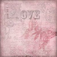 Nostalgie-illustratie met vlinder en tekstelementen in roze pastelkleuren