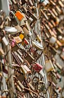 Een close-up van de railing van de Rijnhavenbrug in Rotterdam, waaraan tientallen verliefde stelletjes een slotje hebben vastgemaakt, als bezegeling van hun liefde.