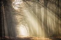 Een bos voetpad verlicht door intense lichtstralen tijdens een herfstochtend. Een afbeelding rustgevende en ontspannende landschap.
