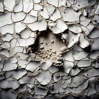 De broze, dode platen die rond het gat zijn opgestapeld lijken bijna levend, alsof ze de onophoudelijke beweging van het verval vastleggen. De monochrome kleuring van het afbrokkelende pleisterwerk onderstreept de melancholische sfeer en benadrukt het contrast tussen de gladde en de geruïneerde staat. De foto herinnert aan de onverbiddelijke vergankelijkheid van alle dingen, aan wat er overblijft van menselijke structuren wanneer ze worden blootgesteld aan de krachten van de tijd. De compositie is zowel minimalistisch als indrukwekkend en weerspiegelt een diepe, universele waarheid over de vergankelijkheid en voortdurende verandering van alles.