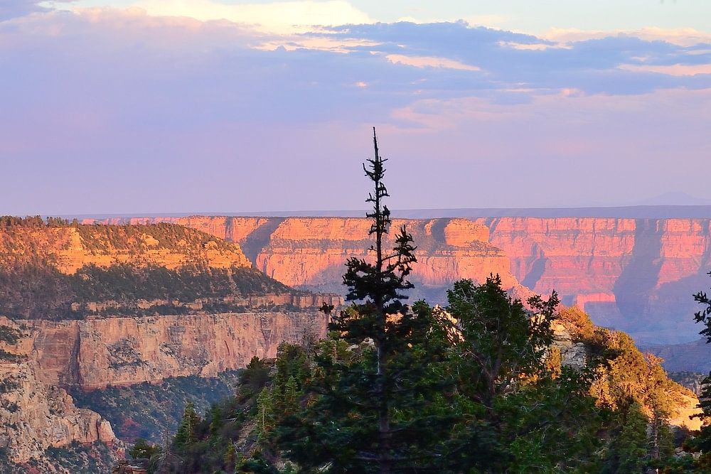 De lucht begint kleur te krijgen bij Bright Angel Point in Grand Canyon National Park, Arizona, VS. We houden echt van die roze tinten gemengd met de oranje gloed van de zonsondergang.