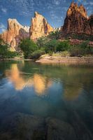 De Patriarchs worden in de vroege ochtend mooi benadrukt in de weerspiegeling in het water van de Virgin rivier.
