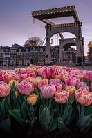 Een foto van kleurrijke tulpen met op de achtergrond de meest bekende brug Amsterdam, namelijk de magere brug. De tulpen maken deze charmante brug nog romantischer.