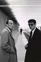 Een zwart-witfoto toont twee mannen op een leeg perron. Beiden dragen klassieke jassen - de een met een strenge, achterdochtige blik, de ander met een zonnebril en koele elegantie. Op de achtergrond wacht een eenzame figuur in de diepte van het perspectief, terwijl het dak met zijn ritmische lijnen de scène onderdompelt in een grafische spanning. Het licht is hard, de schaduwen scherp - alles lijkt beheerst, mysterieus en vol onuitgesproken betekenis.
