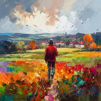 Ontdek de schoonheid van de natuur met dit prachtige digitale kunstwerk van een man die door een weiland loopt op weg naar een dorp. Het groene pad leidt je door de weelderige groene velden en brengt je dichter bij de natuur. Laat je betoveren door de rustgevende sfeer en voeg een vleugje natuurlijke schoonheid toe aan je interieur met dit unieke kunstwerk. Bestel vandaag nog en geniet van de serene kracht van de natuur in je eigen huis.