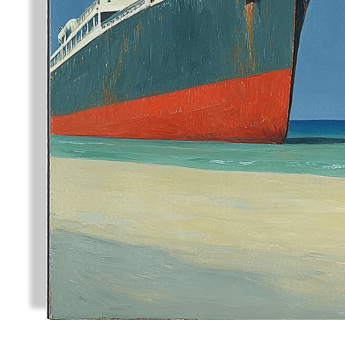 Een olieverfschilderij in de stijl van Edward Hopper toont een eenzame man in pak die aan de rand van een breed, bijna leeg strand staat. Voor hem ligt een roestig schip, al lang verlaten, roerloos op de kust. Een kleine tas rust naast de man - een stil teken van aankomst of vertrek. De heldere lucht en de uitgestrektheid van de zee…