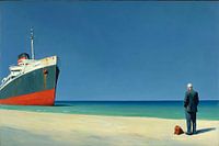 Een olieverfschilderij in de stijl van Edward Hopper toont een eenzame man in pak die aan de rand van een breed, bijna leeg strand staat. Voor hem ligt een roestig schip, al lang verlaten, roerloos op de kust. Een kleine tas rust naast de man - een stil teken van aankomst of vertrek. De heldere lucht en de uitgestrektheid van de zee benadrukken de leegte en het gevoel van isolatie.