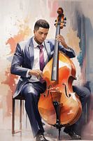 Digitale tekening in een anime en aquarel stijl van een contrabassist.