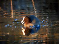 Deze watervogel kwam net boven water en wordt nog omrind door zijn luchtbelletjes op het wateroppervlak. De zwarte veren van de meerkoet steken prachtig af tegen de weerspiegelende wateren, terwijl de witte vlek op zijn voorhoofd de foto…