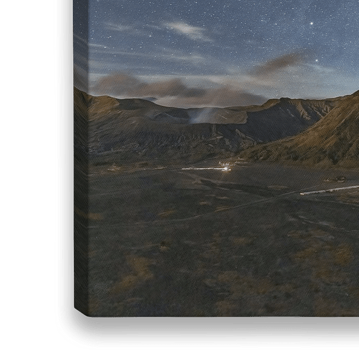 Sterren en melkweg schijnen boven de Bromo Vulkaan terwijl er rook opstijgt uit de krater. Mt Bromo, Indonesië.