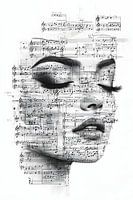 De potloodtekening toont het hoofd van een vrouw dat op een fascinerende manier bedekt is met muzieknoten. De noten lijken als een levend patroon over de huid en het haar van de vrouw te stromen, alsof ze deel uitmaken van haar identiteit. Elke noot is nauwkeurig en gedetailleerd uitgewerkt, waardoor een harmonieus samenspel van vorm en…
