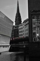Een van de vele kanalen die door het centrum van Hamburg lopen. St. Nikolai kerk op de achtergrond.
