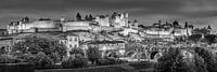 Panorama van de stadswallen van de vestingstad, die is uitgeroepen tot UNESCO Werelderfgoed. Op de voorgrond zie je de oude 14e-eeuwse brug over de rivier de Aude.