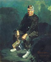 Deze kompel zit mijn zijn lamp op zijn hoofd en lunch in de hand een pijp te roken.
