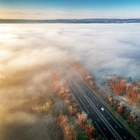 De snelweg A71 in de Allier verdwijnt in de ochtendmist