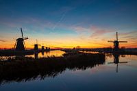 De molens van Kinderdijk bij een mooie oranje zonsopgang. Unesco erfgoed.