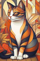 Een majestueuze kat is afgebeeld in een gestileerde geometrische stijl en heeft helder oranje, zwarte en roomwitte tinten. De achtergrond bestaat uit abstracte, bladachtige patronen die de opvallende gelaatstrekken van de kat benadrukken. De algehele compositie straalt elegantie en evenwicht uit.