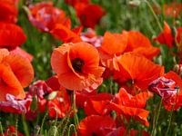 Een klaproosbloem is in beeld met zijn bloesem wijd open in een veld met klaprozen.