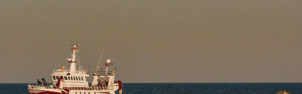De motorkotter UK 145 Teunis van Atje passeert de Noordpier bij Wijk aan Zee. Op de vroege morgen met het opkomende zonnetje op de heldere ochtend. Op de horizon een vrachtschip te zien samen met een booreiland.