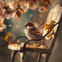 Prachtige afbeelding van een huismus genietend in de najaarszon op een brocante tuinstoel. Op de stoel bruinkleurige blaadjes net als de blaadjes van de roze kersenbloesem boven het hoofd van de mus. Scherpte op de mus en vervaging in de achtergrond. Mooie afbeelding in aardse tinten. Natuur. Vogels. Landelijk.