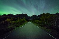 De weg naar Nusfjord.. De muur... een indrukwekkend gebergte met pluimen van het noorderlicht erboven...