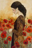 In dit schilderij, geschilderd in de karakteristieke stijl van Gustav Klimt, ontvouwt zich een betoverende scène waarin een vrouw harmonieus versmelt met een gloeiend veld klaprozen. De vrouw staat in het midden van het schilderij, omringd door weelderige, rode klaproosbloesems die oplichten in levendige kleuren en een sfeer van passie…