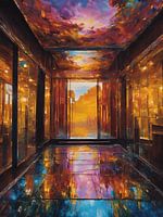 Het kunstwerk “De mysterie” van Jolique Arte toont een intrigerende, moderne ruimte waarin transparantie en reflecties centraal staan. Het lijkt alsof de vloeren, muren en trappen volledig van glas zijn, waardoor een mysterieuze en bijna onwerkelijke sfeer ontstaat. Het gebruik van lichte en zachte tinten versterkt het gevoel van ruimte en openheid, terwijl de architectonische lijnen en perspectieven de kijker uitnodigen om dieper te kijken en te ontdekken wat erachter ligt.