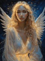 Laat je betoveren door de magische uitstraling van deze vrouwelijke engel, gevangen in een prachtig samenspel van klassieke olieverf en moderne Artificial Intelligence. Dit unieke kunstwerk straalt mystiek en diepgang uit, met vleugels die oplichten als sterren in de nacht. Omgeven door talloze delicate lichten en lampjes, baadt de engel in een gloed van mysterie tegen een donkere, bijna kosmische backdrop.