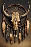 Laat je betoveren door de kracht van de wildernis in deze unieke vector illustratie van een geblakerde stierenschedel met veren en Zuid-Amerikaanse symbolen