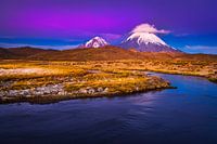 De foto toont een landschap met de vulkanen Parinacota en Pomerape op de grens tussen Chili en Bolivia en een riviertje op de voorgrond. Het is een foto in avondstemming die werd genomen in het blauwe uur een half uur na zonsondergang in het Lauca nationaal park
