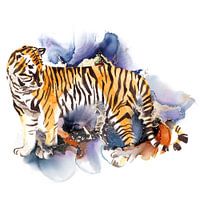 Er komt een prachtige tijger uit de duisternis tevoorschijn.
