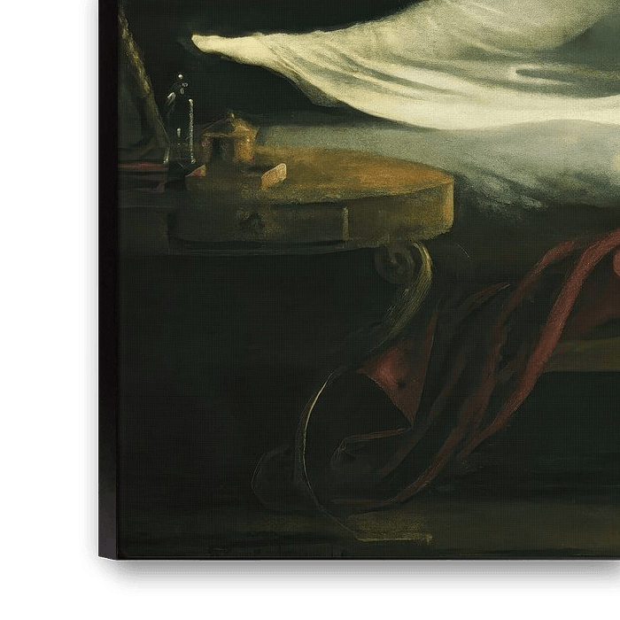 De beelden van het schilderij komen rechtstreeks overeen met de klassieke symptomen van een slaapverlamming. Een vrouw ligt in een gekwelde, levenloze houding, haar lichaam verwrongen op een manier waarvan men vroeger geloofde dat het nachtmerries bevorderde. Dit vertegenwoordigt de volledige fysieke verlamming en hulpeloosheid die de lijder voelt. Op haar borst hurkt een incubus, een kwaadaardige koboldachtige demon uit de folklore. Deze figuur geeft vorm aan de verpletterende druk op de borst en het overweldigende gevoel van verstikking dat kenmerkend is voor de ervaring. De incubus kijkt de kijker rechtstreeks aan, doorbreekt de vierde wand en versterkt het gevoel van een echte, angstaanjagende aanwezigheid in de kamer.