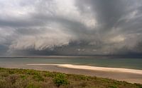 Het beeld legt een dramatische en krachtige scène vast van een onweer dat het strand in Nederland nadert. De foto toont de onheilspellende donkere wolken en bliksemschichten die de lucht verlichten, waardoor een visueel opvallend contrast ontstaat met het kalme water van het strand. Het beeld benadrukt de rauwe kracht en energie van de natuur wanneer de storm de kust nadert. Het beeld toont ook de rust van het strand voor de storm. Het beeld toont de ruwe kracht en schoonheid van de natuur, evenals de rust van het strand voor de storm. Het benadrukt ook het contrast tussen de kalmte van het strand en de energie van de storm. Het beeld kan gevoelens van ontzag en verwondering oproepen, maar ook een herinnering aan de onvoorspelbaarheid van het weer.