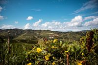 Door de bloemen heen zie je de uitgestrekt heuvels en wijngaarden van Barolo in Alba, Italië.