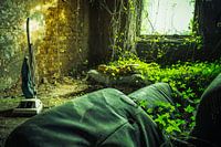 De bakstenen muur op de achtergrond vertoont duidelijke tekenen van verval en het zonlicht dat door het raam naar binnen schijnt, verlicht de dichte groene bladeren die de vloer en het meubilair bedekken. De natuur lijkt hier niet alleen de ruimte te hebben veroverd, maar ook de tijd zelf te hebben bevroren - de stofzuiger herinnert aan de laatste poging om het verval een halt toe te roepen voordat de ruimte definitief werd verlaten.