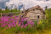 Ingegraven ruïne van een goudzoekerhuis in de Yukon, Canada