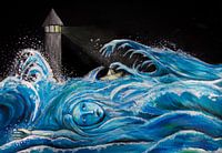 Thetis is een nereïde uit de Griekse mythologie. Zij is bekend als de moeder van Achilles en is een godin van het water. In dit acrylverf schilderij is ze afgebeeld als wilde golven. Ze is de zee. Haar golf armen grijpen een klein bootje. Haar gezicht staat enigszins verveeld. In de achtergrond staat een vuurtoren als baken. De lucht is donker, het is nacht.