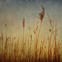Rieten grassprieten bewegen zachtjes in het ochtendlicht als dansers. Romantisch vormgegeven met verschillende texturen.