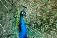 Als een pauw een radslag maakt, wil hij indruk maken op de aanvaller of hem van zijn kippen weghouden. Deze pauw was bijzonder volhardend, zodat de fotograaf de gelegenheid had hem vanuit vele posities te fotograferen. Een echt buitenkansje, want vaak duurt dit poseren maar kort en wordt alle glorie weer opgevouwen.